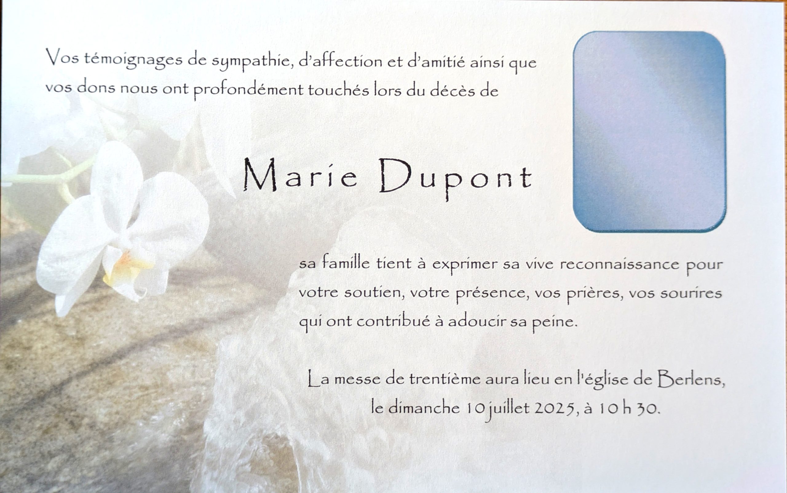 1. Choisir un thème et une écriture2. Choisir un texte3. Avec ou sans Photo couleur ou noir blanc4. Indiquer le nombre de cartes Vous pouvez envoyer votre commande et photo à l’adresse mail : office@pfruffieux.chLes cartes sont fournies avec les enveloppesDélai d’impression après commande 3-5 jours ouvrables